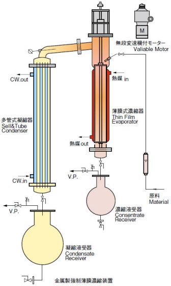 本裝置為強(qiáng)制薄膜蒸發(fā)濃縮裝置。薄膜蒸發(fā)器等設(shè)備和所有管路均采用不銹鋼材料,熱效率高。對批量處理有效。此原理與薄膜蒸發(fā)器薄膜濃縮器FE-80相同。